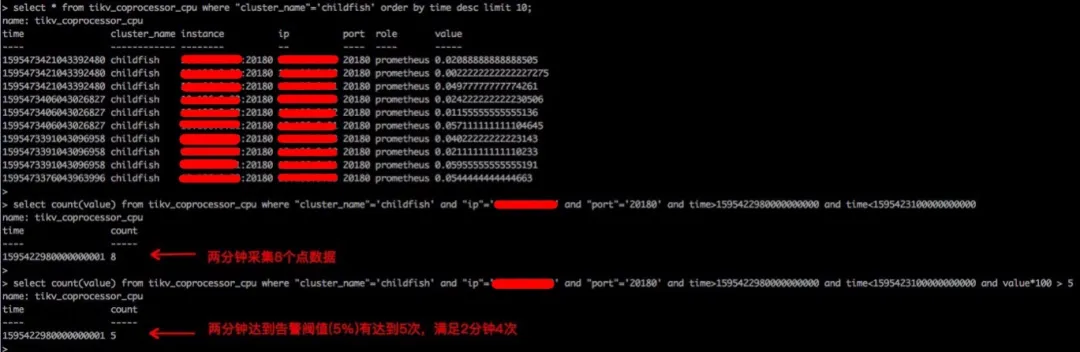 其次,集群在任务采集时,我们可以拿到具体的集群信息,包括ip、端口和角色。报警服务根据报警模版里的规则,将具体的规则映射成查询语句,如下图所示。