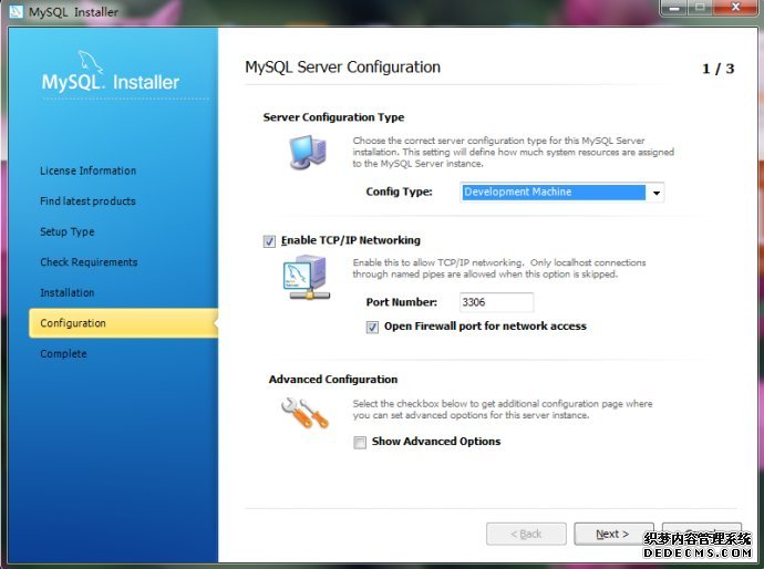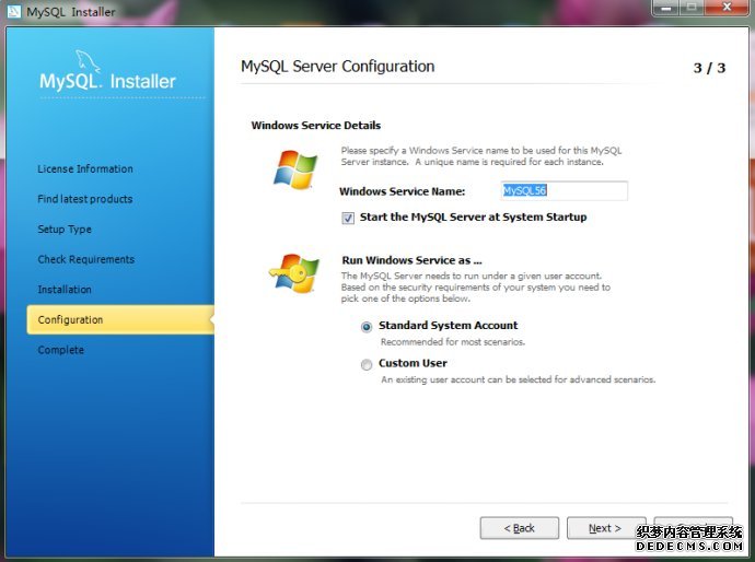 13、在如图1-16的界面中,可以设置系统服务器名称,是否在系统启动的同时自动自动MySQL数据库服务器,可用默认选项,点击“Next”: