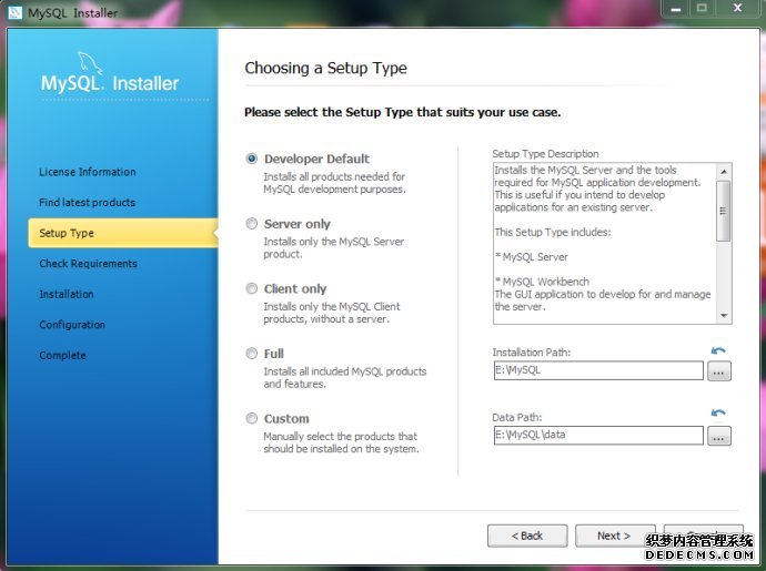 4、根据右侧安装类型描述文件选择适合自己的安装类型,如图1-6所示,注意修改安装路径,以防重装系统后,需要再次安装MySQL: