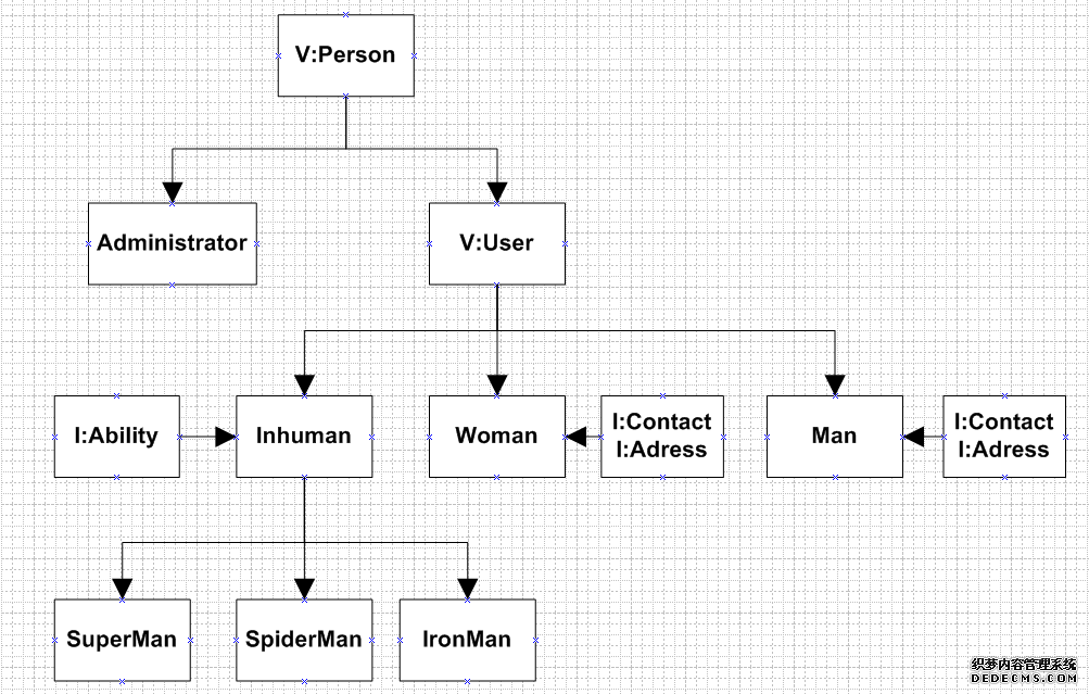 从图中可以看出,由抽象类Person派生出Administration与抽象类User。类Man与类Womam实现了接口Address与接口Contact,Inhumans则实现了Ability接口。
