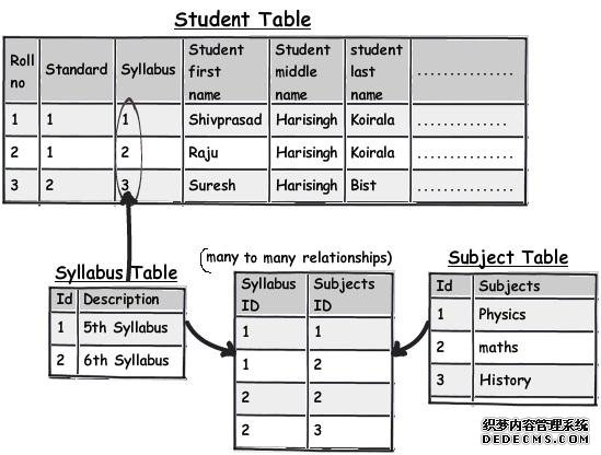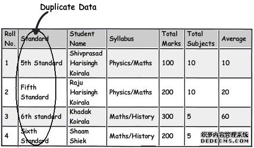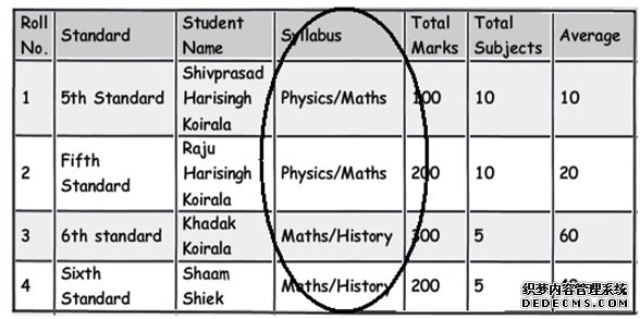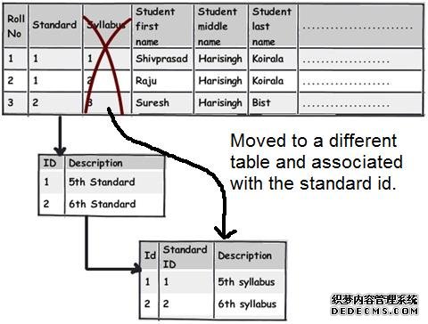 留心注意那些仅仅部分依赖主键的列。例如上面这个图表,我们可以看到这个表的主键是 Roll No.+Standard。现在请仔细观察 syllabus 字段,可以看到 syllabus课程) 字段仅仅关联依赖) Standard课程级别) 字段而不是直接地关联依赖)某个学生Roll No. 字段)。