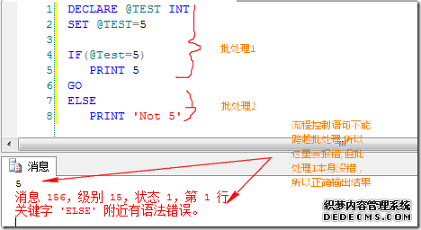流程控制语句只能在单个批处理段(Batch),用户自定义函数和存储过程中使用。不能跨多个批处理段或者用户自定义函数和存储过程。