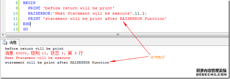 很多人会把Return语句和RAISERROR函数搞混,区别在于RAISERROR函数会引发错误,并且程序依然会往下执行:
