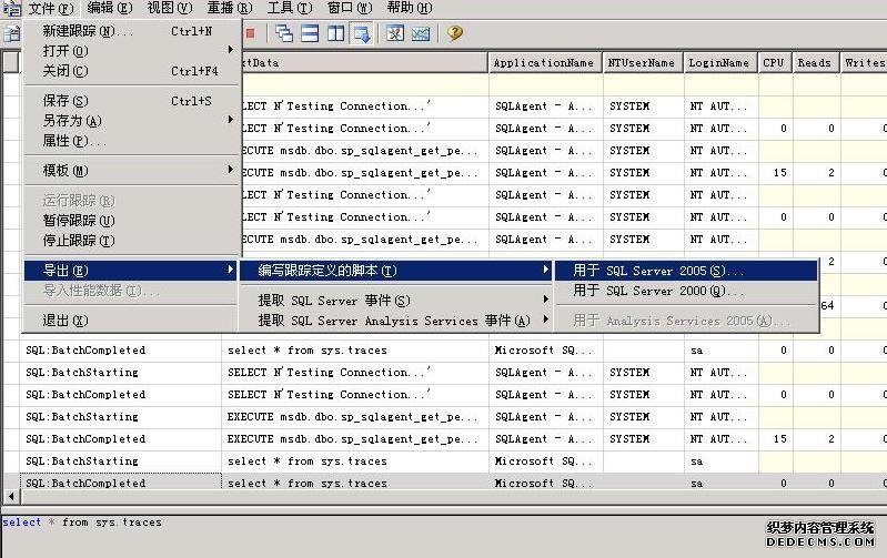 这里的例子不想用SQL Profiler进行举例,因为我觉得它仅仅是方便我们跟踪而已。但是它在跟踪时既会把输出写入目标文件或者表(然后选择保存文件中保存表)还有把跟踪信息写入运行Profiler的客户端。把跟踪信息写入到运行Profiler客户端,这个比直接写入文件往往会慢。大家可以想想为什么?不过倒是可以用Profiler图形化方式定义跟踪,然后导出生成的跟踪SQL。具体如下: