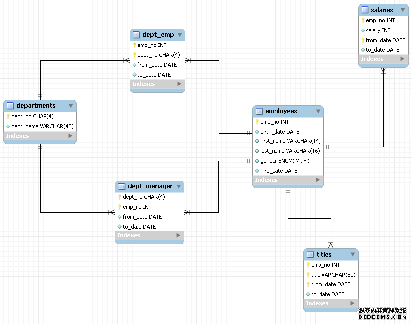 为了讨论索引策略,需要一个数据量不算小的数据库作为示例。本文选用MySQL官方文档中提供的示例数据库之一:employees。这个数据库关系复杂度适中,且数据量较大。下图是这个数据库的E-R关系图(引用自MySQL官方手册):