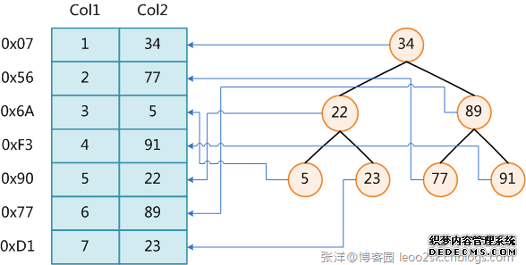 图1展示了一种可能的索引方式。左边是数据表,一共有两列七条记录,最左边的是数据记录的物理地址(注意逻辑上相邻的记录在磁盘上也并不是一定物理相邻的)。为了加快Col2的查找,可以维护一个右边所示的二叉查找树,每个节点分别包含索引键值和一个指向对应数据记录物理地址的指针,这样就可以运用二叉查找在O(log2n)的复杂度内获取到相应数据。