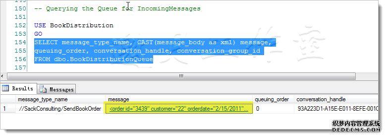 使用Receive语句http://msdn.microsoft.com/en-us/library/ms186963.aspx)从队列中读取行消息),也可以删除已经读取的消息。Receive的结果可以填充到常规表中,也可以在局部变量中执行其他操作,或发送到其他service Broker消息。如果消息是XML数据类型的消息,则可以直接借助TSQL的XQuery来操作。