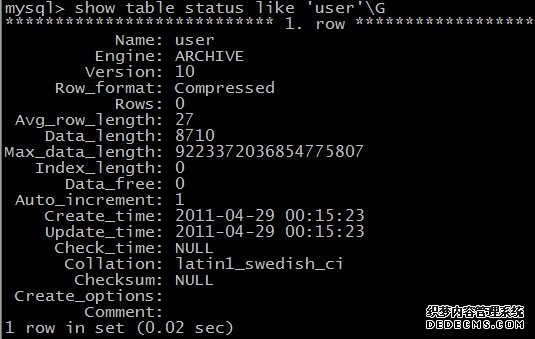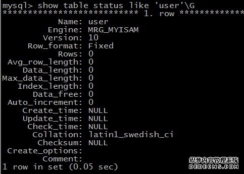 查看创建后表user的信息,可见表的当前存储引擎是merge,如图所示: