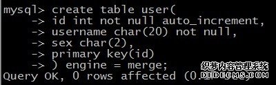 例如,假设要创建一个名为user的表,此表包括id,用户名username和性别sex三个字段,并且要设置表类型为merge。则可用如下的方式创建此数据表,