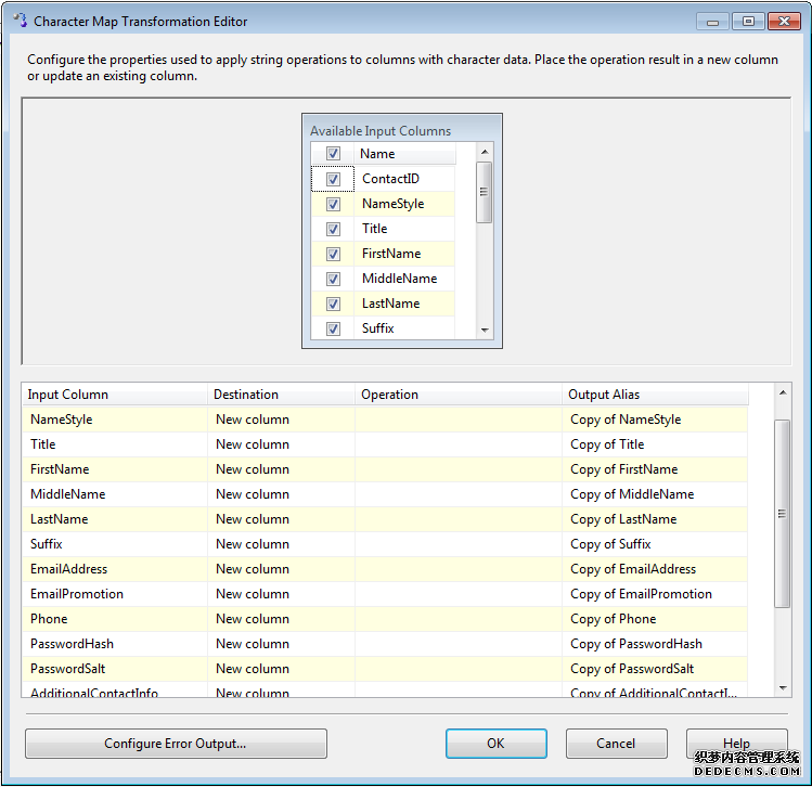 特征映射转换如图4-18展示数据流中列的特征,它的编辑界面很简单,只有一个标签界面,点击要进行映射的列,可以选择需要添加新列或需要更新的列。可以在Output Alias列中给原来的列一个别名,选择要进行的操作,可以进行的操作类型有: