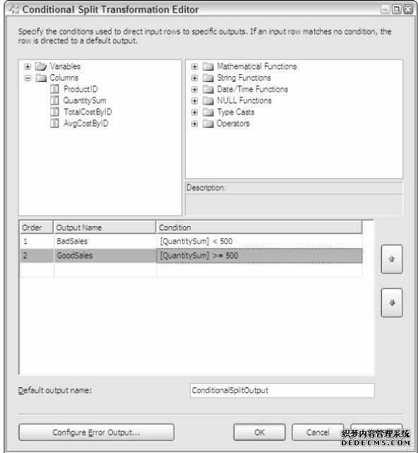 根据条件分割数据是一个在数据流中添加复杂逻辑的方法,它允许根据条件将数据输出到其他不同的路径中。例如,可以将产品中总数量超过500的输出到一个路径,少于500的输出到另一个路径。如图4-19。可以从上面的属性结构中拖放一个列或者代码段,然后根据逻辑重命名而不是使用默认值Case1,还可以编辑输出列的名字。
