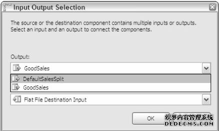 可以使用表达式来读取字符数据,设置判断条件,例如下面表达式判断城市名字的第一个字符是F,SUBSTRING(City,1,1) == "F"。将这个转换连接到下一个其他转换的时候会弹出一个对话框提示选择数据输出路径,如图4-20.在这个图中,可以看到有两个选择,GoodSales输出到一个路径,其他输出到另一个路径。还可以新建其他的路径以供选择。
