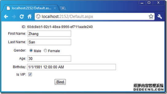 在浏览器中打开该Web页面,点击Bind按钮,你会发现绑定的数据已经正确显示在了对应的控件中: