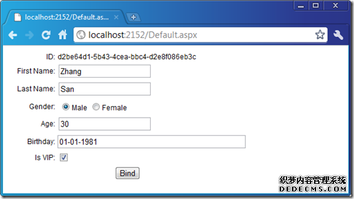 虽然通过DataBinder实现了对多个控件的批量绑定,但是并不完美。一个显著的问题是:作为生日的字段不仅仅显示了日期,还显示了时间。我们如何让日期按照我们要求的格式进行显示呢?DataBinder为了提供了三种选择。