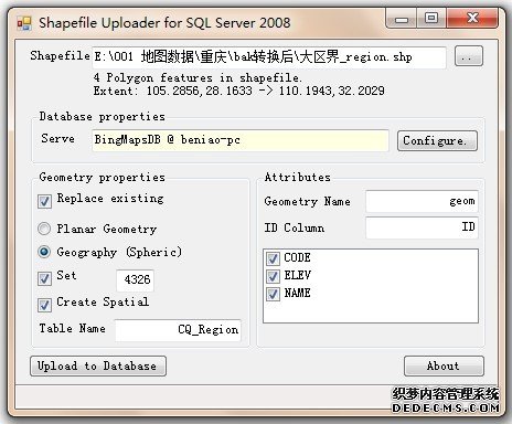 如本文篇前的截图,使用SQL空间导入工具实现将ESRI的shpfile地图空间数据导入SQL Server 2008其实非常简单,在导入的时候注意表名和SRID就可以了,其他的可以不用管。如下图演示了将重庆市的大区边界地图数据导入到SQL Server 2008中。