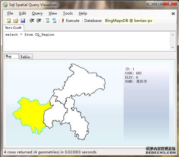 实现可以查询可以在SQL Server Management Studio中执行对表CQ_Region)的的全表查询,于空间结果选项中可以看到如下图所示的空间呈现效果。