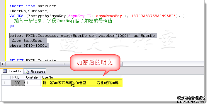 注意,在通过证书加密时,DecryptByAsymKey返回的是varbinary类型的加密数据。