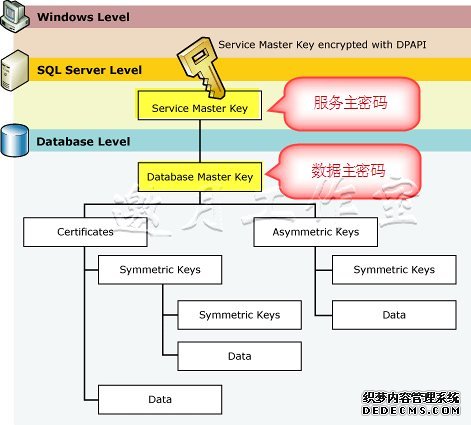 在SQL Server中的加密由层次结构形式进行处理以提供多级别的安全。SQL Server包含两个用于加密数据的密钥类型。如下图: