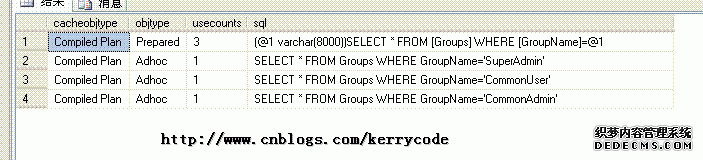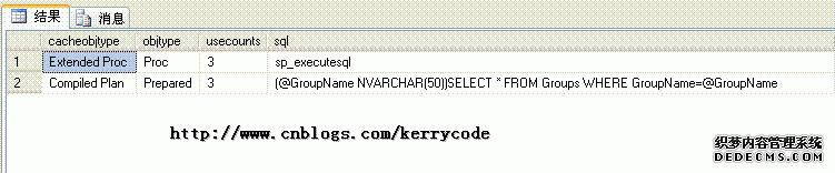 下面我们来看看EXECUTE , SP_EXECUTESQL的执行效率,首先把缓存清除执行计划,然后改变用@GroupName值SuperAdmin、CommonUser、CommonAdmin分别执行三次。然后看看其使用缓存的信息