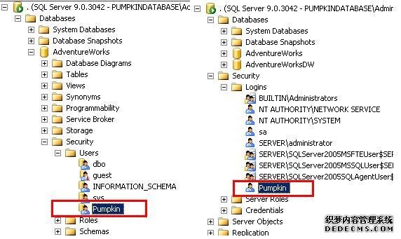 注意这里的Pumpkin,以前我一直都以为这就是SQL SERVER里的用户,但是通过搞一搞之后才发现并非如此。 数据库连接串里的Pumpkin,在SQL SERVER里严格的说,应该叫Login,其实它是一个登录帐号,并不是数据库里用来访问表和操作数据的一个用户。即右图中的Pumpkin。它在数据服务器的Security"Logins的结点下,这里面列出来的是所有的登录帐号。它们的作用就是用来连接数据库并通过验证。