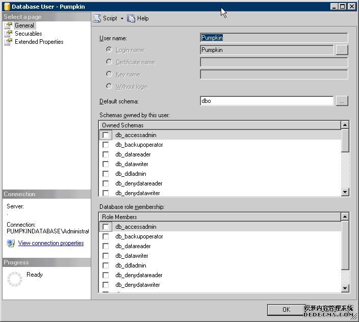 请注意,我们刚看出了关键的问题所在:访问表的用户其实必须是USER Pumpkin,不是那个LOGIN Pumpkin。所以说,在SQL SERVER 2005中,如果要访问某张表,那首先需要建立一个USER,并赋给它访问的权限。同时,要注意USER与LOGIN的关系是一对一的,即某个USER 在一定时间内只对应着唯一一个LOGIN。