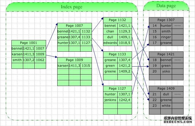 针对上图,如果我们同样查找“Green”,那么一次查询操作将包含以下IO:3个索引页的读取+1个数据页的读取。同样,由于缓存的关系,真实的IO实际可能要小于上面列出的。