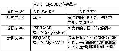 数据库中的每个表在数据库目录中都作为三个文件存在:一个格式描述)文件、一个数据文件和一个索引文件。每个文件的基名是该表名,扩展名指明该文件的类型。扩展名如表5-1所示。数据和索引文件的扩展名指明该表是否使用较老的 ISAM 索引或较新的 MyISAM 索引。