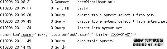 下面是一个实例,它是作为一个短客户机会话的结果出现在常规日志中的信息中的,这个会话在 test 数据库中从mytest.pet复制一个表,并插入一行到该表中,然后删除该表: