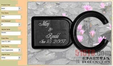 几乎所有的DrinkMate商品都是打上水印后销售出去的,用于婚礼的商品基本上都包括了新娘新郎的名字以及婚礼日期的水印,如图2显示的那样,这个Silverlight 2应用程序的目标就是让快要结婚的情侣能够方便地预览他们自己设计的不同商品,变换颜色、字体以及布局,保存这些信息便于以后可以调出查看,以节约他们的选择时间,你可以从