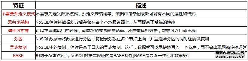 NoSQL数据库并没有一个统一的架构,但是它们都普遍存在表2所示的一些共同特征。