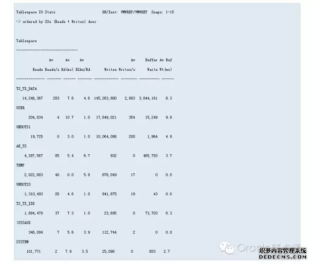 我们还可以在AWR报告"Tablespace IO Stats"部分得到更详细的信息