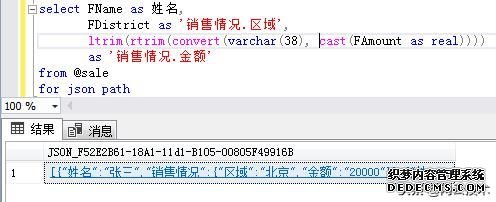 见识了神奇的for json auto子句,我们在看看另一个神奇的for json path子句,该子句使用列别名或列名来确定 JSON 输出中的键名称。