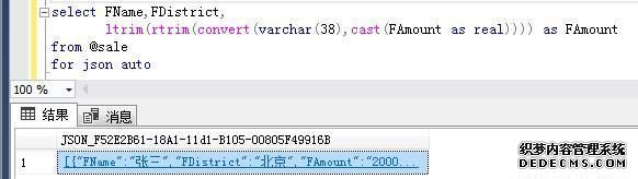 在查询的from子句中加上 for json auto,查询结果就会自动转成json文本,这是最简单的一种转换方式。