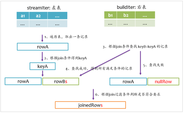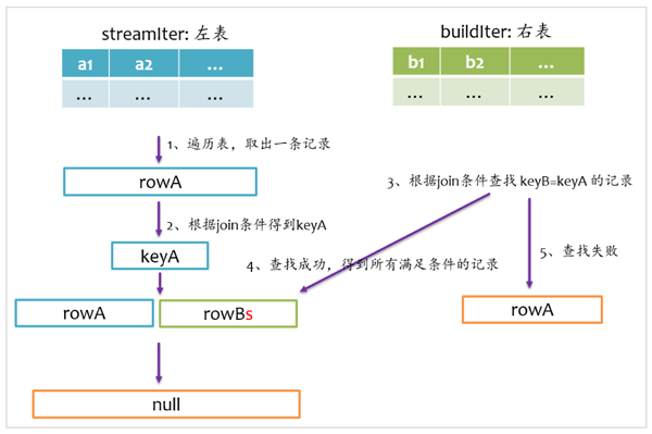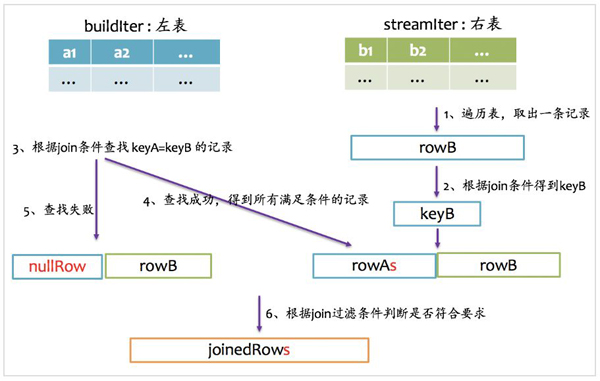 inner join是一定要找到左右表中满足join条件的记录,我们在写sql语句或者使用DataFrame时,可以不用关心哪个是左表,哪个是右表,在spark sql查询优化阶段,spark会自动将大表设为左表,即streamIter,将小表设为右表,即buildIter。这样对小表的查找相对更优。其基本实现流程如下图所示,在查找阶段,如果右表不存在满足join条件的记录,则跳过。