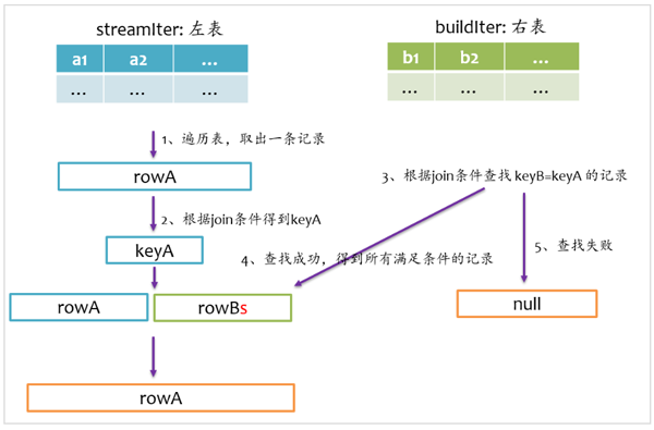 left anti join与left semi join相反,是以左表为准,在右表中查找匹配的记录,如果查找成功,则返回null,否则仅返回左边的记录,其基本实现流程如下图所示。
