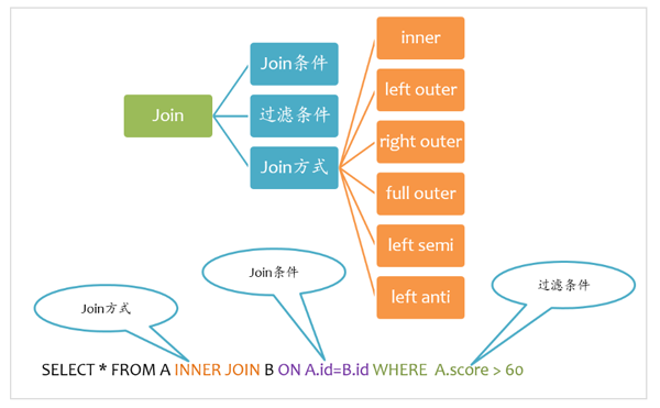 如下图所示,Join大致包括三个要素:Join方式、Join条件以及过滤条件。其中过滤条件也可以通过AND语句放在Join条件中。