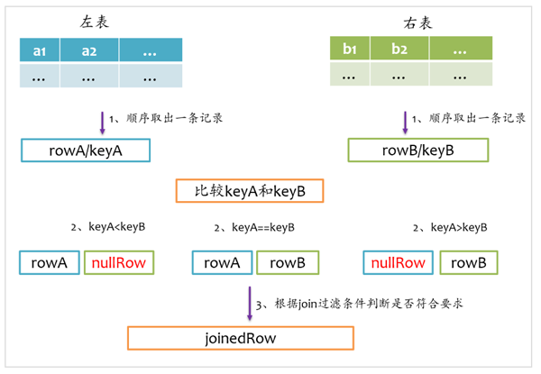 由于左表和右表已经排好序,首先分别顺序取出左表和右表中的一条记录,比较key,如果key相等,则joinrowA和rowB,并将rowA和rowB分别更新到左表和右表的下一条记录;如果keyA<keyB,则说明右表中没有与左表rowA对应的记录,那么joinrowA与nullRow,紧接着,rowA更新到左表的下一条记录;如果keyA>keyB,则说明左表中没有与右表rowB对应的记录,那么joinnullRow与rowB,紧接着,rowB更新到右表的下一条记录。如此循环遍历直到左表和右表的记录全部处理完。