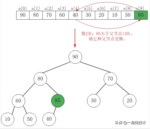85 再继续往前走之后,它要和 80 再进行比较,同理可得:也就是说这个结点每次和它的父亲比,如果它大于它的父亲的话就交换,直到它不再大于它的父亲。