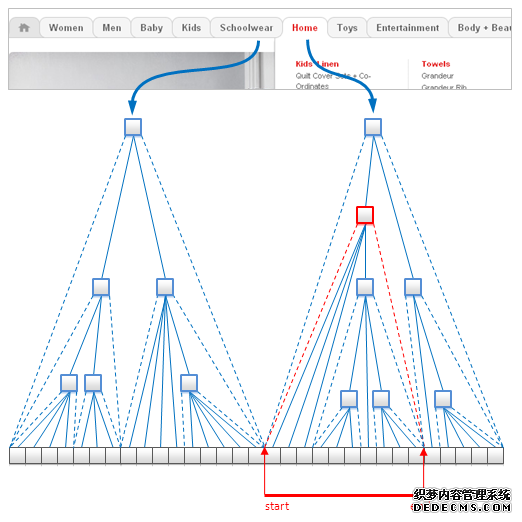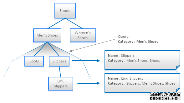 这个技术对于全文搜索引擎来说非常有帮助,因为其可以允许把一个层级结构转成一个文档。上面的示图中我们可以看到所有的商品或Men’s Shoes下的子分类可以被一条很短的查询语句处理——只需要给定个分类名。
