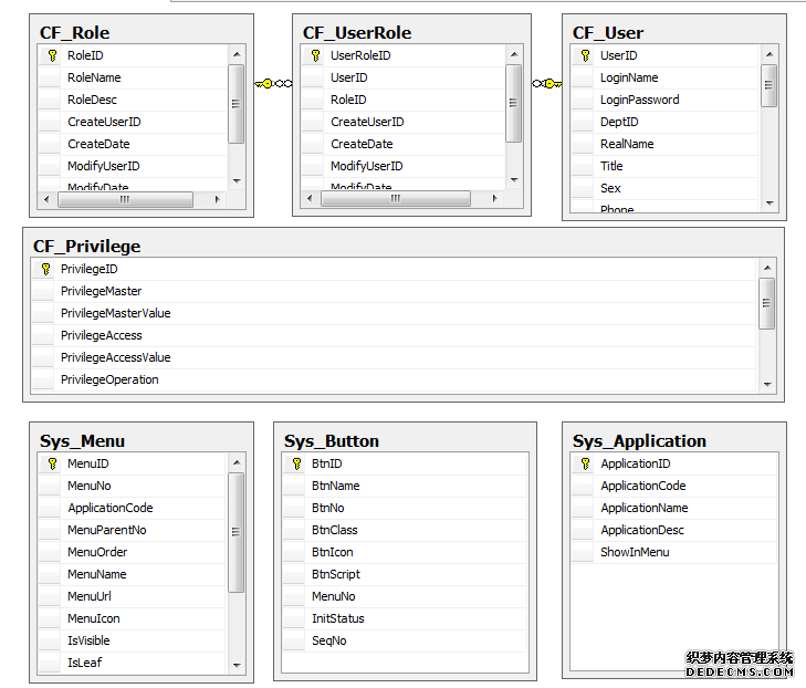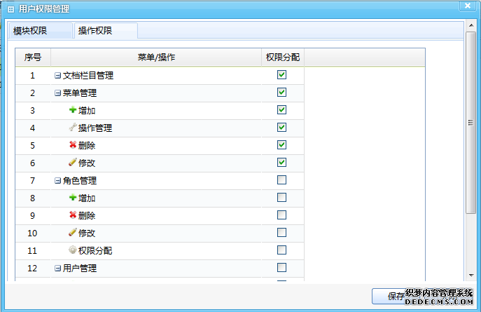 假设现在我们设计好了,应用场景包括 模块、菜单、和操作,那么应该有以下六种关系