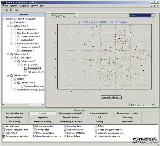 Tanagra (http://eric.univ-lyon2.fr/wricco/tanagra/) 是使用图形界面的数据挖掘软件,采用了类似Windows资源管理器中的树状结构来组织分析组件。Tanagra缺乏高级的可视化能力,但它的强项是统计分析,提供了众多的有参和无参检验方法。同时它的特征选取方法也很多。
