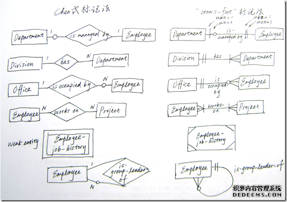 我们来看一下另一种使用较多的标记法,“crow’s-foot”鱼尾纹)标记法,并与前面介绍的标记法进行一个简单对比。