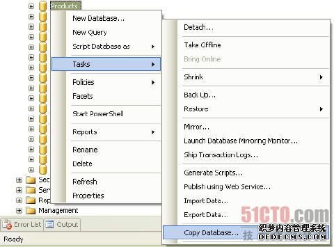 1、 通过SSMS连接到 SQL Server 2005实例。接着,右键单击我们需要在这个实例中迁移的生产数据库。从弹出菜单中,选择“任务”然后如下面截图所示选择“复制数据库”选项。这时会打开复制数据库向导。