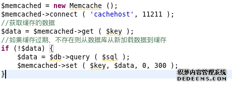 说起内存模式缓存,我们自然就会想起大名鼎鼎的Memcached。在互联网发展过程中,Memcached曾经解救了数据库的大部分压力,做出了巨大的贡献,直到今天,它依然是缓存服务器的首选。Memcached的常见使用方式类似下面的代码: