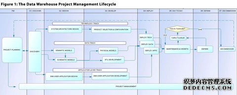 如图1所示,数据仓库项目有3个轨道(tracks):数据轨道,技术轨道和应用层轨道。当您在整理任何数据库项目计划时,我建议您以这三个轨道为模板来管理和同步您的活动。当您向技术决策者( TDMs ) ,商业决策者( BDMs ) ,和所有其他该数据仓库项目参与者讲解您的计划时,您也可以把图1当作一个高级的概要图来使用。
