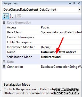 在相当多的在线调研后,我实现了一个RepositoryBase类,使用他您可以快速实现您的数据层,所示为测试通过的例子。 首先,用对象关系映射器译者注:Visual Studio自带工具)来产生序列化的LINQ实体:在Visual Studio中打开dbml文件,在空白区域某处左键单击,弹出属性窗口,设置“Serialization Mode属性”为“Unidirectional”。
