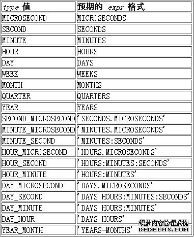 MySQL 允许任何expr 格式中的标点分隔符。表中所显示的是建议的 分隔符。若 date 参数是一个 DATE 值,而你的计算只会包括 YEAR、MONTH和DAY部分(即, 没有时间部分), 其结果是一个DATE 值。否则,结果将是一个 DATETIME值。