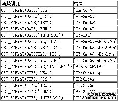 ◆ GET_FORMAT(DATE|TIME|DATETIME, 'EUR'|'USA'|'JIS'|'ISO'|'INTERNAL')