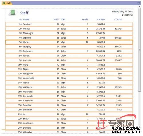 如果您只希望把DB2数据移到一个报表中,那么这就是最好的方法。例如,如果您选择了一个表,然后选择Create栏和Report选项,Access 2007会立即为DB2数据建立一个报表: