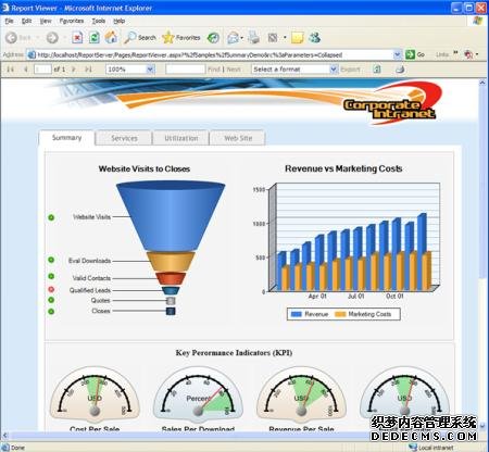 日立咨询公司热衷于使用报表服务中高级的视觉化技术。“我们很兴奋能够使用报表服务2008中的可视化技术,”Turley 说道,“Reporting Services Gauges 所提供的设计环境可以让你创建带有计量器的仪表盘,就如同你的汽车中的仪表盘一样。”
